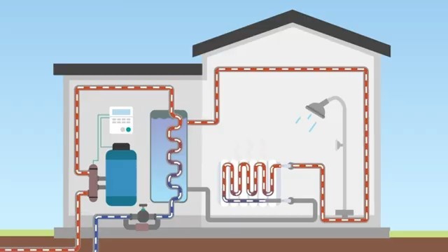 Schéma tepelného čerpadla při vytápění domu a ohřevu vody. Teplo ze země se využívá pro radiátory i sprchu
