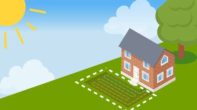 Horizontální kolektor pod zahradou zásobuje dům teplem z půdy. Ukazuje praktické využití systému u rodinného domu