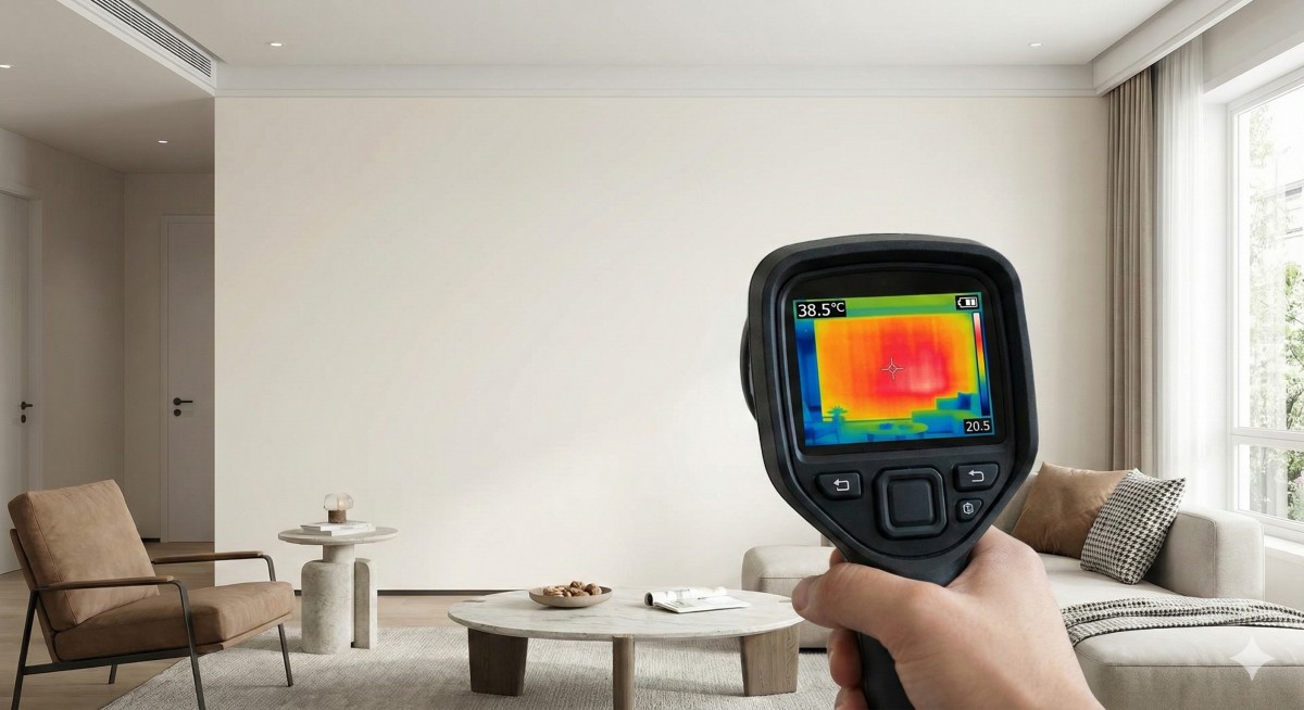 Topení grafenovým nátěrem je neviditelné. Na fotografii lze vidět měření termokamerou zdi, na které je instalován