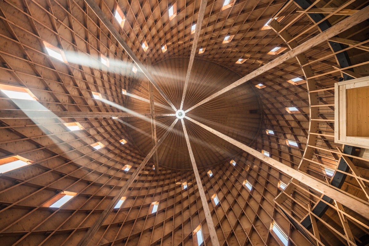 Jemná dřevěná konstrukce protkaná drobnými okny umožňuje, aby sluneční paprsky vždy pronikly do nitra kaple