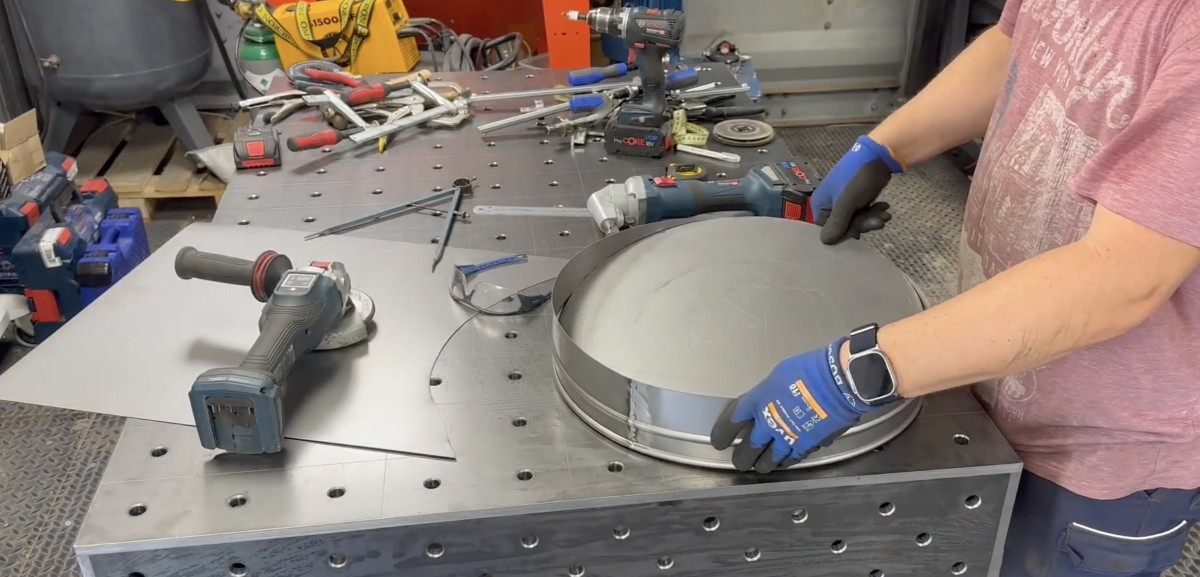 Kruhový díl byl přesně usazen do spodní části pláště sudu. Spoj byl nejprve nabodován, aby držel správnou polohu