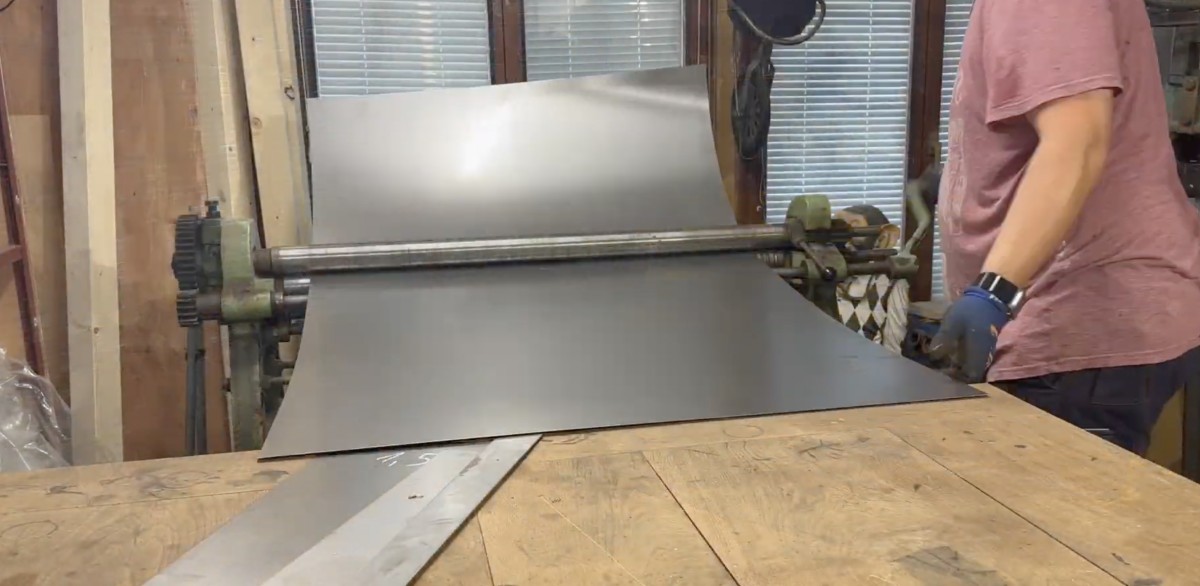 Ocelový plech byl stočen do tvaru budoucího sudu pomocí zakružovačky