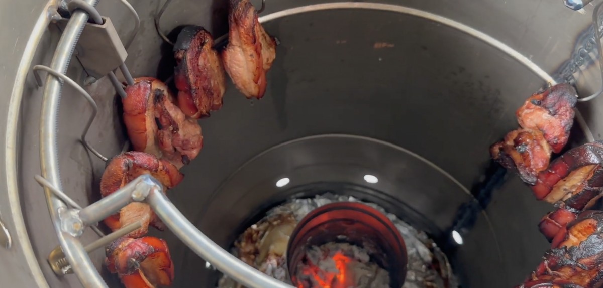 Maso je zavěšeno na hákách po obvodu horního nosného kruhu. Zdroj tepla tvoří rozžhavené uhlí ve spodní části grilu
