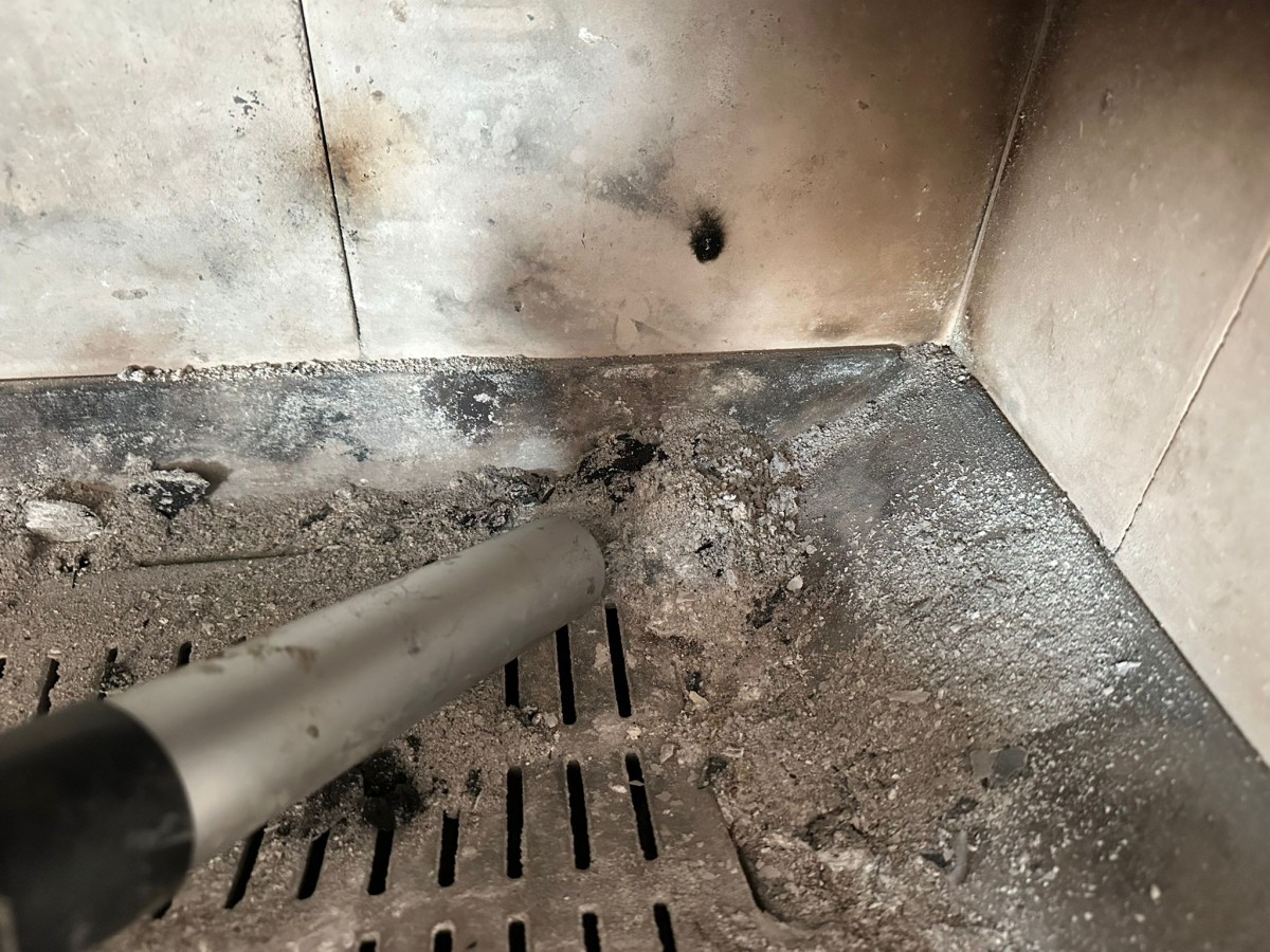 Zbytky popela, který zůstal v kamnech, Jakub vysaje vysavačem na popel. Díky takovému pečlivému úklidu je topeniště naprosto čisté