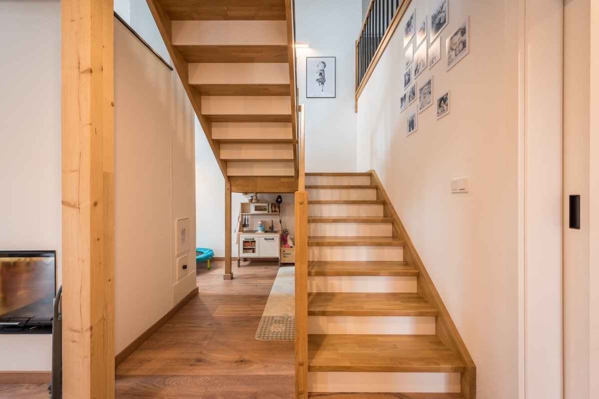 Dřevěné schodiště je šikovně umístěno tak, že příjemně doplňuje celý prostor