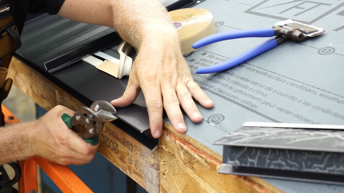 Kouskem kartonu chraňte povrch plechu před poškrábáním, zatímco ručními kleštěmi pevně uzavíráte spodní lem panelu.