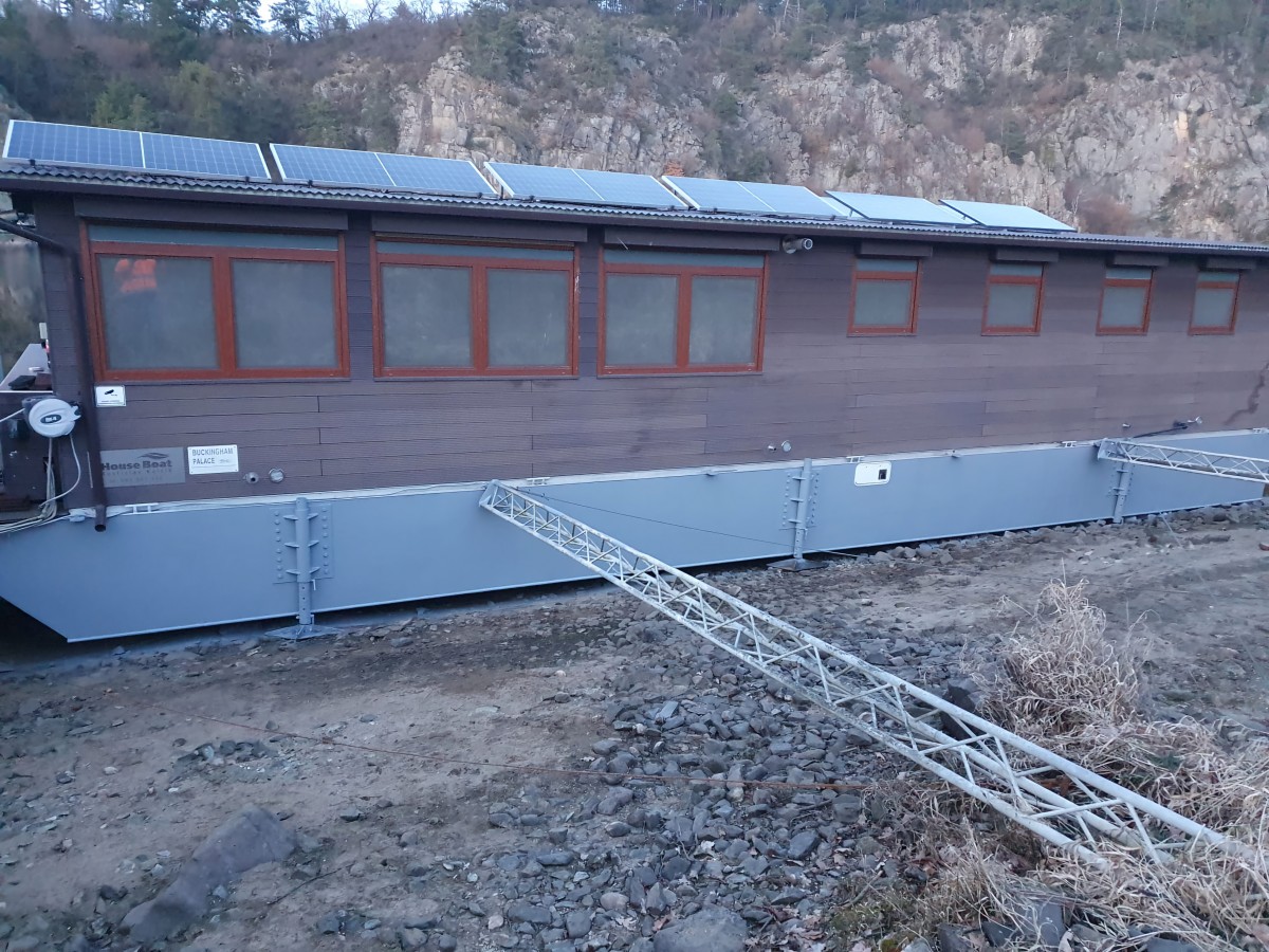V zimě se voda na Slapech vypouští, takže si hausbót „stoupne“ na připravené nohy a lze okolo něj chodit suchou nohou