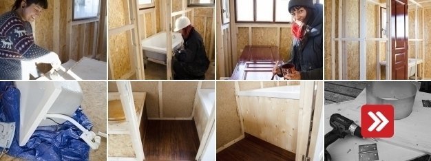 Na řadě je první místnost – koupelna. Než postavíme stěny koupelny, nainstalujeme vanu či vaničku pro sprchový kout. Nezapomeňte na natažení přívodu vody až ke skříňce, kterou jsme vyrobili minule, a vybudování odtoku. Jakmile máme přítok i odtok vody, vanu pevně zafixujeme. Poté už můžeme postavit dřevěné rámy stěn této místnosti stejným způsobem, jako jsme stavěli všechny obvodové stěny. Vsaďte do rámu dveře a pusťte se do výroby suché toalety.