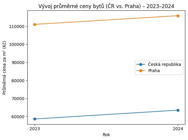 Graf ukazuje vývoj průměrné ceny bytů za m? v ČR a v Praze v letech 2023–2024 podle dat ČSÚ