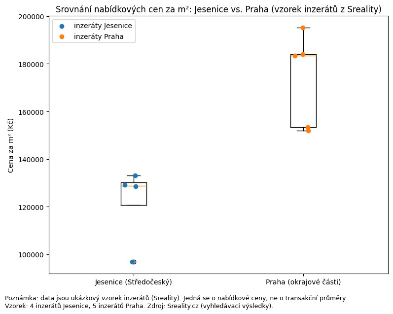 Graf ukazuje rozdíl v nabídkových cenách za m? mezi Jesenicí a okrajovou Prahou při podobné dojezdové vzdálenosti do centra. Jde o orientační srovnání vycházející z vybraného vzorku inzerátů