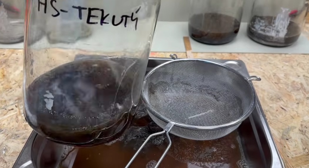 HS-tekutý rozpustil ucpávku mnohem lépe. Obsah sklenice je téměř homogenní kaše bez pevných chuchvalců vlasů