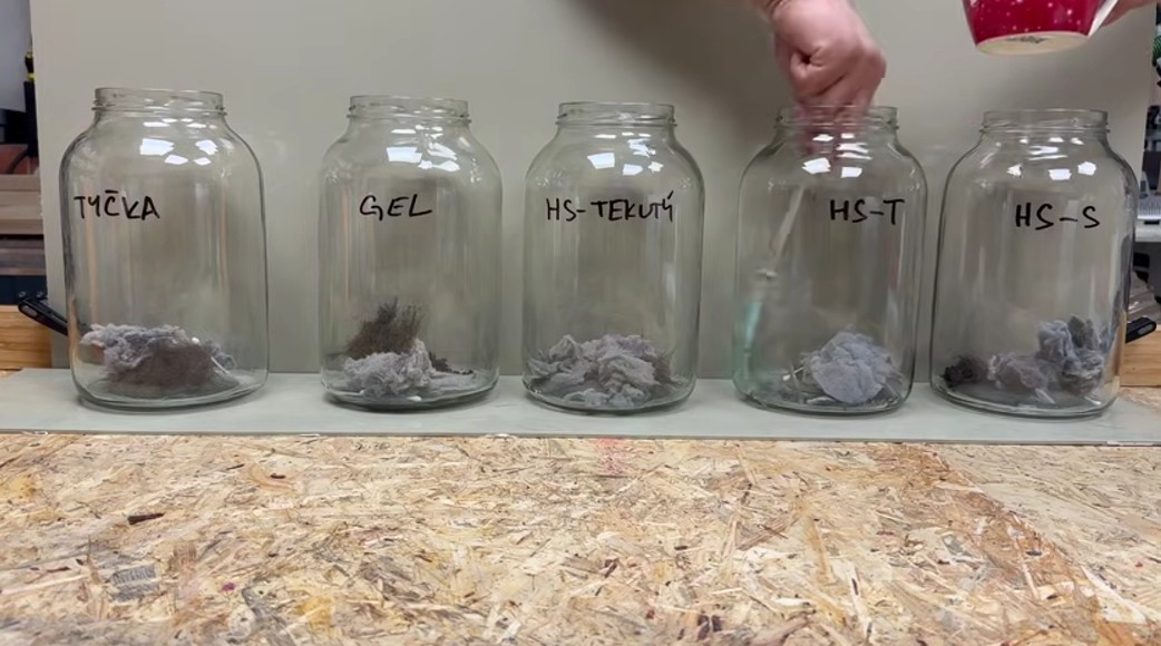 Lukáš přidává do sklenic další porci odpadu, aby měl každý čistič stejnou šanci. Teď už je směs opravdu blízká tomu, co potkáte v domácím sifonu