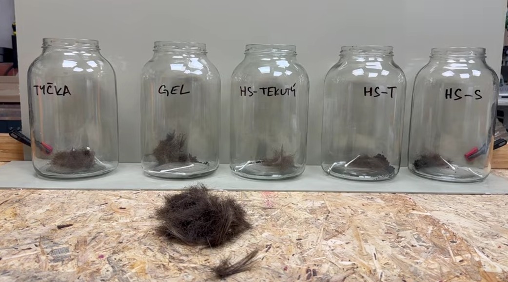 Lukáš rozdělil stejné množství vlasů do všech sklenic, aby měl test naprosto férový