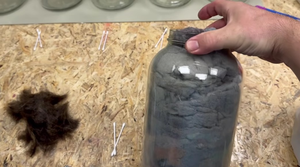 Lukáš vytahuje ze sklenice obří nános prachu ze sušičky, který dokáže ucpat každý odpad. Ukazuje, jak extrémní zatížení musely čističe zvládnout