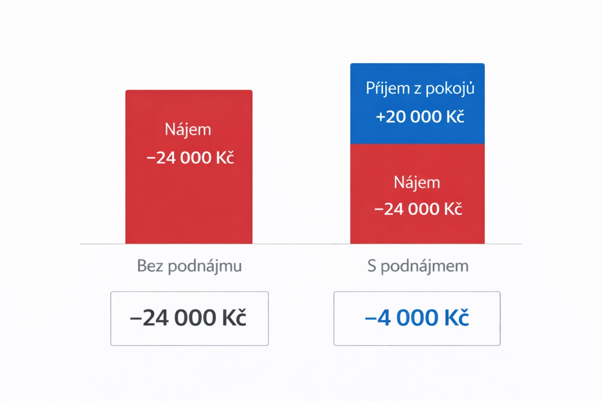 Z původního nájmu 24 000 Kč se díky příjmu z pronájmu pokojů ve výši 20 000 Kč stává reálný měsíční náklad přibližně 4 000 Kč