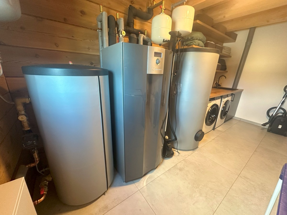 V technické místnosti je umístěný bojler, jednotka tepelného čerpadla země-voda a pračka se sušičkou