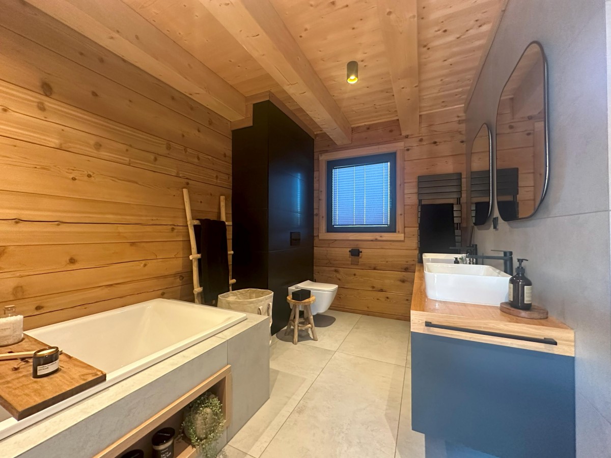 V druhé koupelně byste opět našli umyvadlovou desku s dvěma umyvadly, WC, sprchu, a navíc i obrovskou vanu