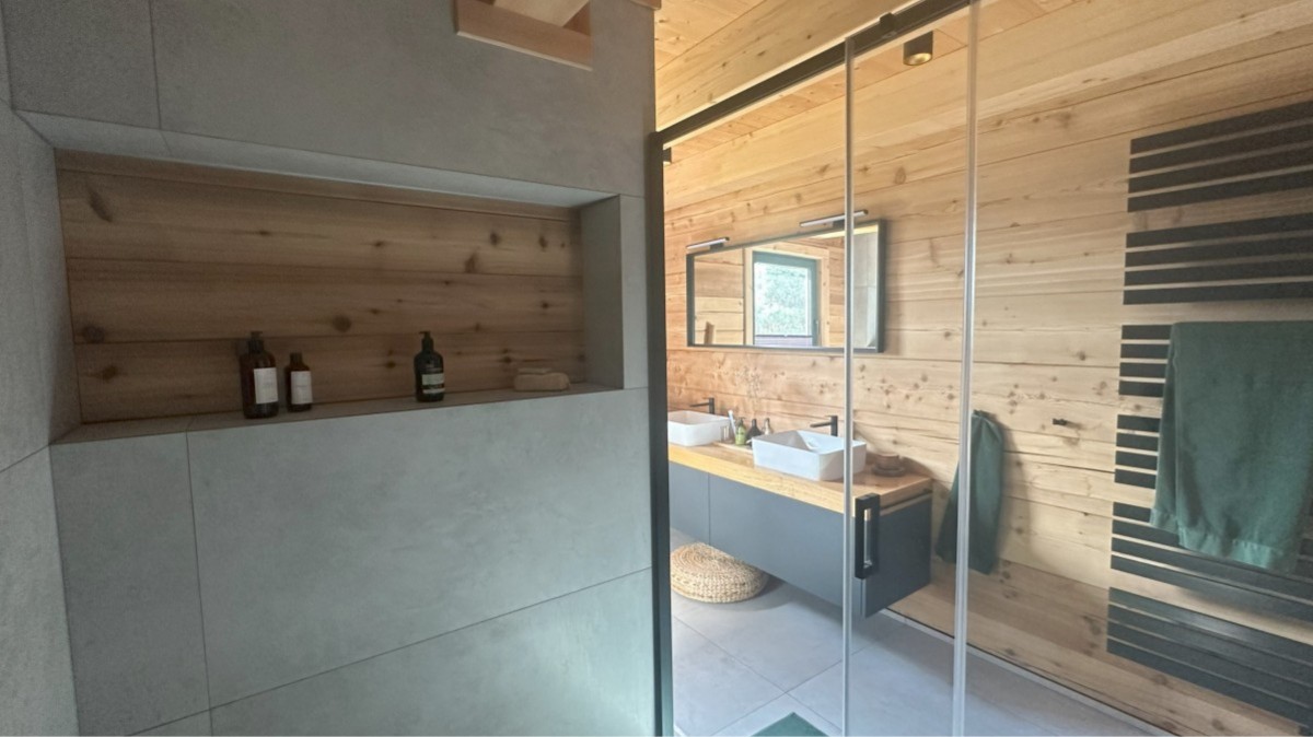 Uvnitř sprchy walk-in je navržená i praktická nika na odkládání hygienických potřeb