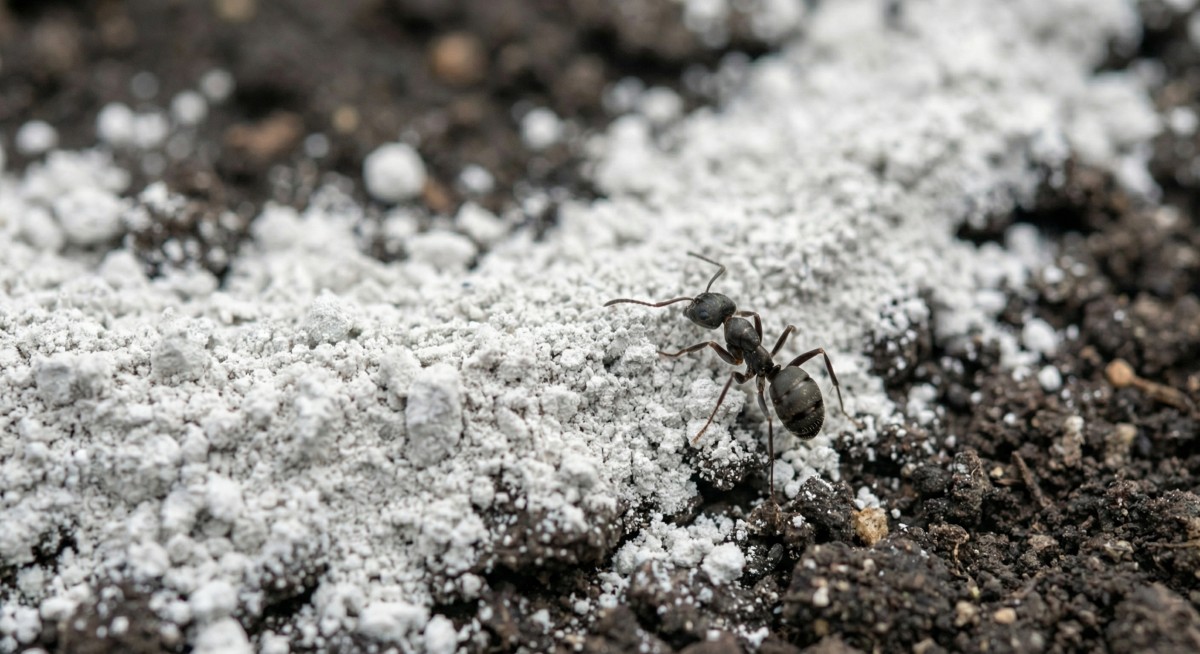 Tato makrofotografie ukazuje mravence, který narazil na bariéru z křemeliny. Jemný prášek je pro hmyz dráždivý a působí na něj odpudivě, čímž chrání vaše sazenice