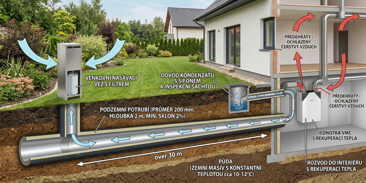 Tento detailní řez ukazuje kompletní cestu vzduchu od venkovní věže přes dlouhé podzemní potrubí až do domácí větrací jednotky