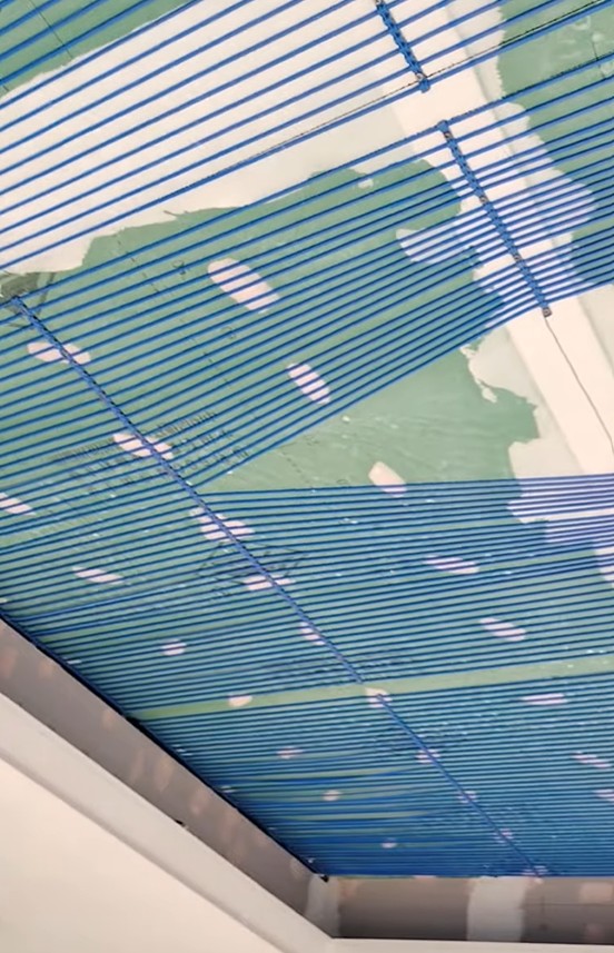 Detail stropní instalace kapilární rohože s hustou sítí modrých trubiček upevněných na podkladní desce. Rohože jsou uloženy těsně pod budoucí omítkou, aby vytvořily souvislou sálavou plochu