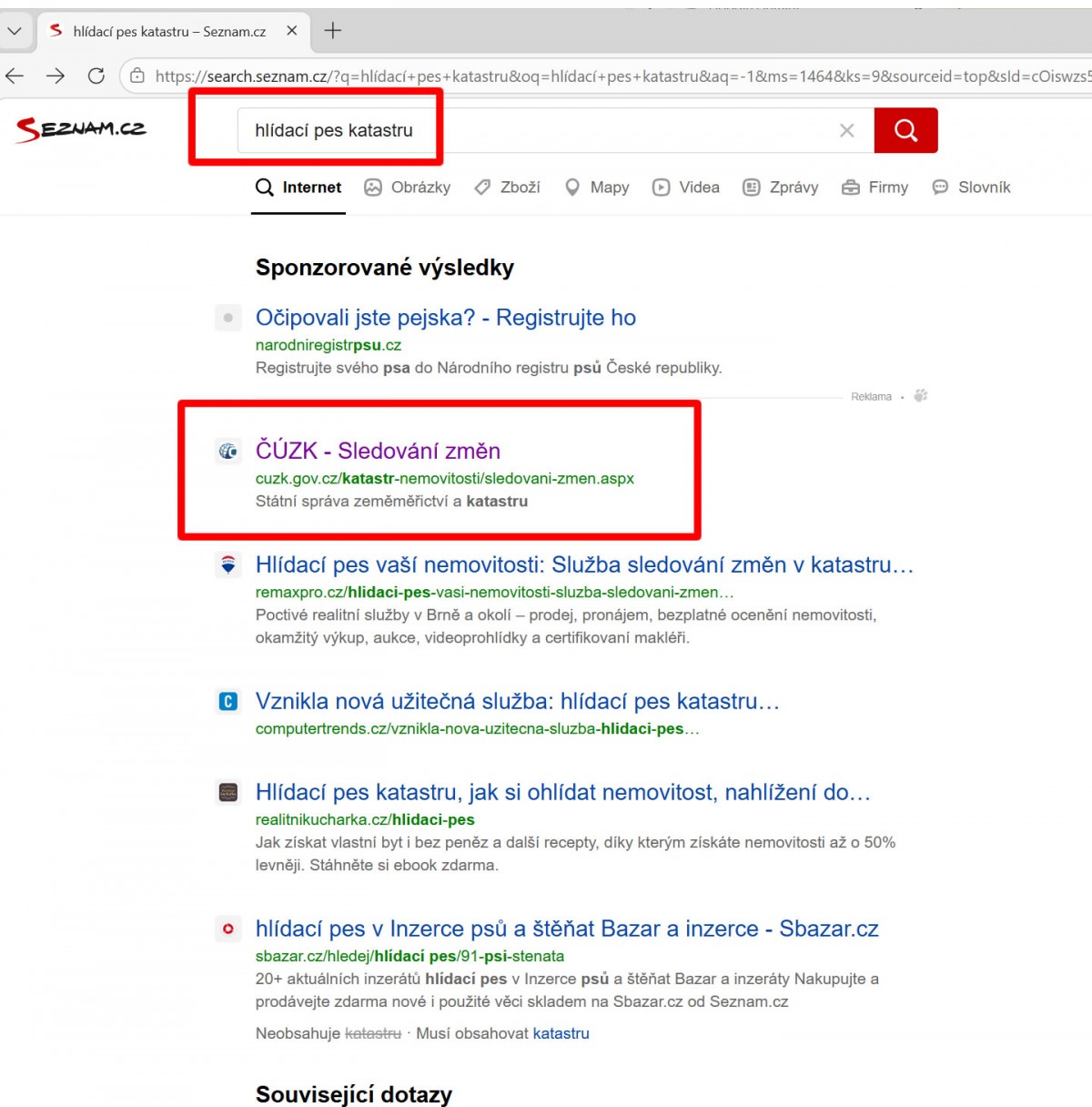 Do vyhledávače napíšeme Hlídací pes katastru a klikneme na ČUZK