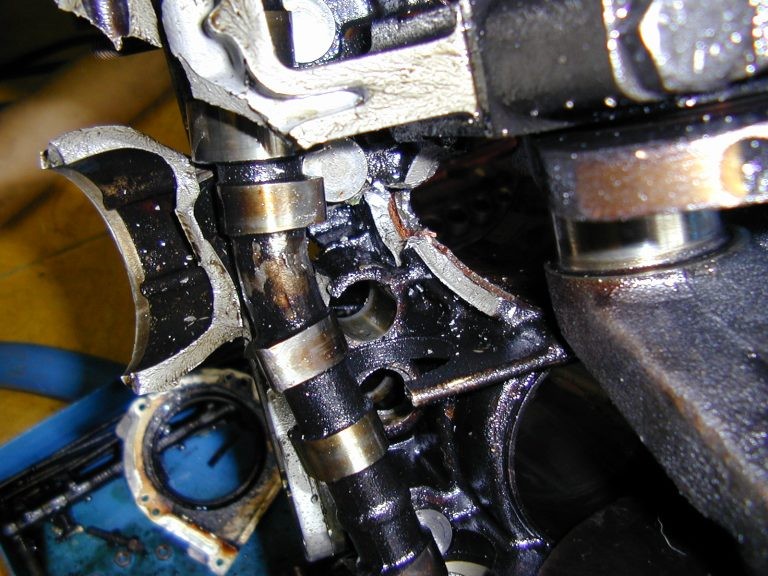 Na fotografii je detail rozlomeného motorového bloku s viditelným poškozením vačkového hřídele a jeho ložisek. Vnitřní části jsou pokryté směsí oleje, kovového prachu a úlomků z prasklého hliníkového odlitku. Takové poškození obvykle následuje po katastrofálním selhání ojnice, která v okamžiku havárie rozmetá okolní části motoru. Tento pohled odhaluje rozsah destrukce, který už není možné opravit.