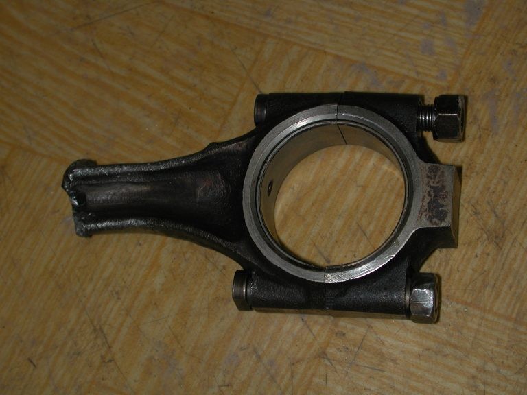 Na fotografii je zlomená ojnice z motoru malé kogenerační jednotky, která spojuje píst s klikovým hřídelem. Kovový díl je prasklý v místě největšího namáhání, což naznačuje, že došlo k únavové nebo nárazové poruše při vysokém zatížení motoru. Takové poškození vedlo k katastrofální havárii motoru, kdy ojnice prorazila blok a zničila část klikového mechanismu.