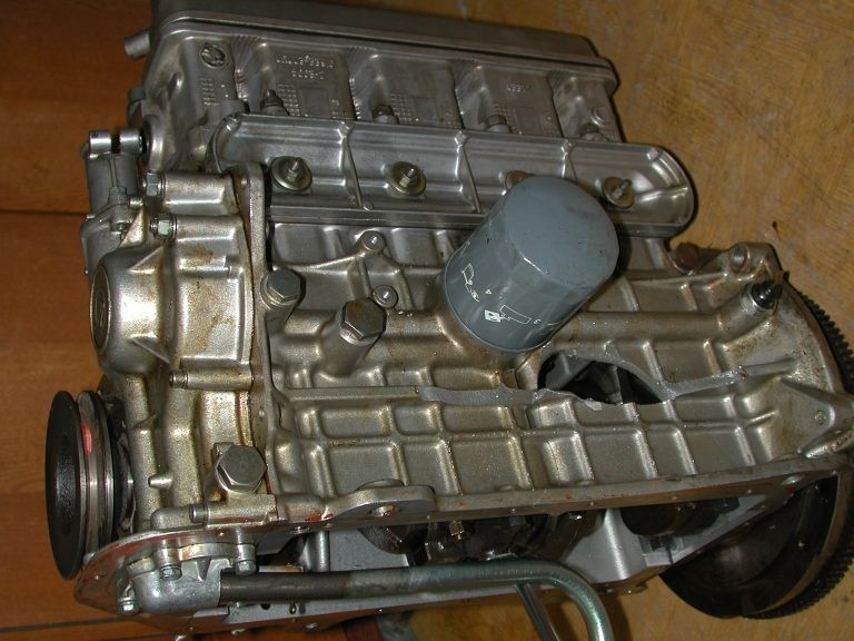 Na fotografii je spalovací motor z malé kogenerační jednotky, který sloužil k výrobě elektřiny a tepla. Motor byl upraven pro stacionární provoz a propojen s generátorem. Viditelný otvor v bloku válců napovídá, že došlo k mechanické poruše (pravděpodobně destrukci ojnice nebo klikového mechanismu, což bývalo častou závadou u dlouhodobě zatížených motorů v domácích teplárnách).