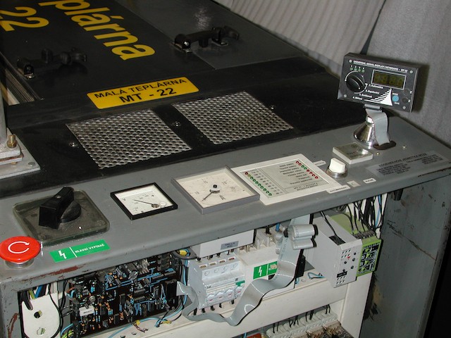 Na fotografii je ovládací panel malé kogenerační jednotky MT-22, označované jako Malá teplárna. Panel obsahuje měřicí přístroje, kontrolky, hlavní vypínač i elektronické řídicí moduly, které umožňovaly sledovat výkon a provozní stav zařízení. Tento typ jednotky dokázal současně vyrábět elektřinu i teplo a byl typickým příkladem domácí technické tvořivosti devadesátých let.