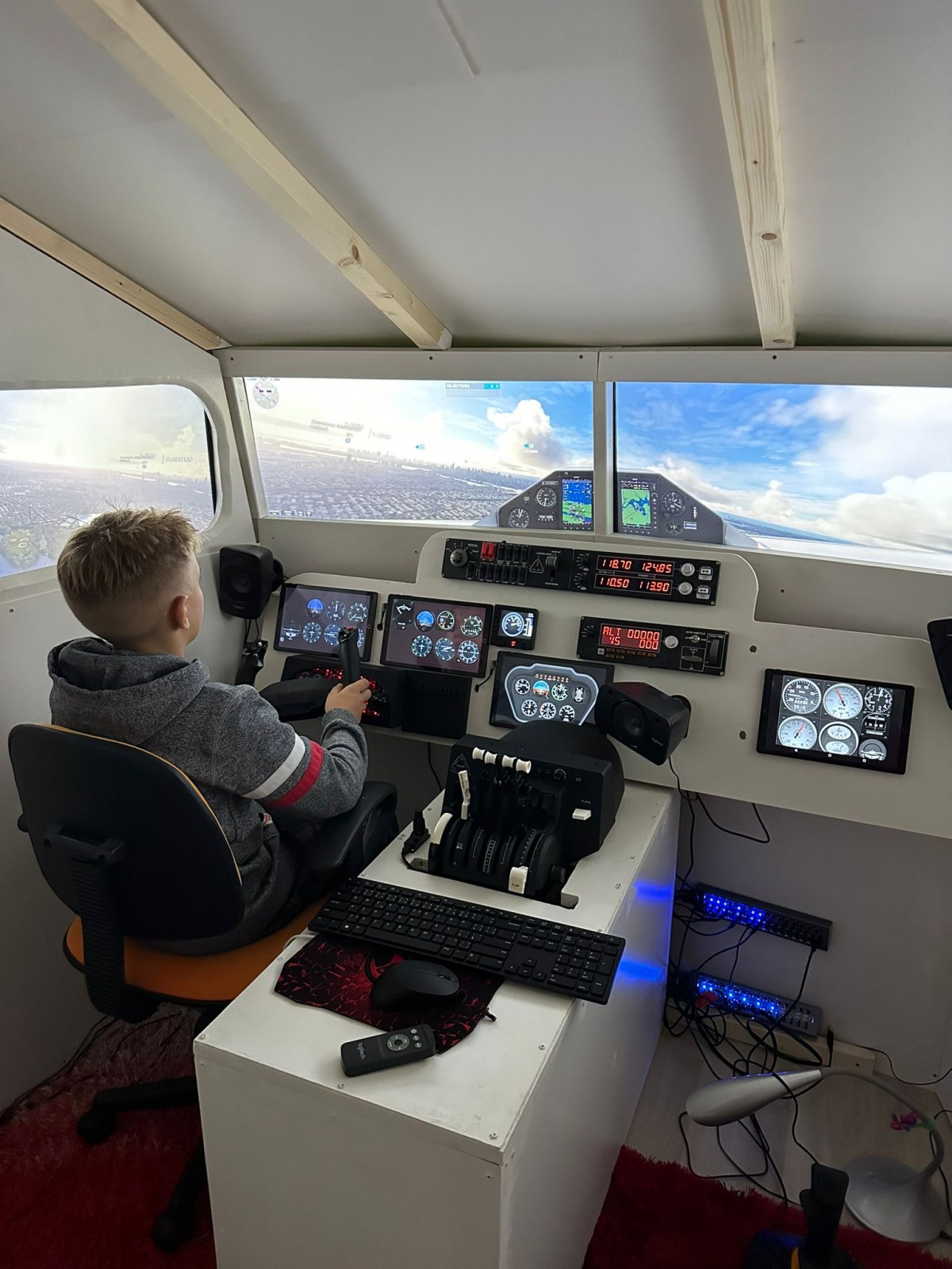 Velký vzor viděl ve svém dědečkovi, který celý život létal nad Českou republikou. Chtěl být jako on, a tak mu jeho otec postavil letecký simulátor s reálným kokpitem. Kdo by řekl, že konstrukce z KVH hranolů, čtyři monitory a jedna počítačová hra dokážou vykouzlit tolik radosti v dětských očích. Tatínek Michal nás vzal do kokpitu a vysvětlil princip celé konstrukce.