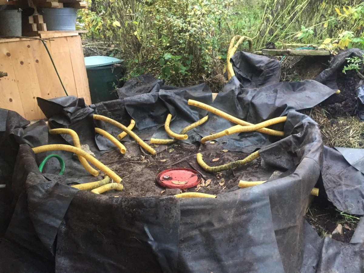 Příprava bioreaktoru na plnění. Žluté trubky přivedou vzduch k biomase a červený uzávěr uprostřed umožní odvádění přebytečné vody