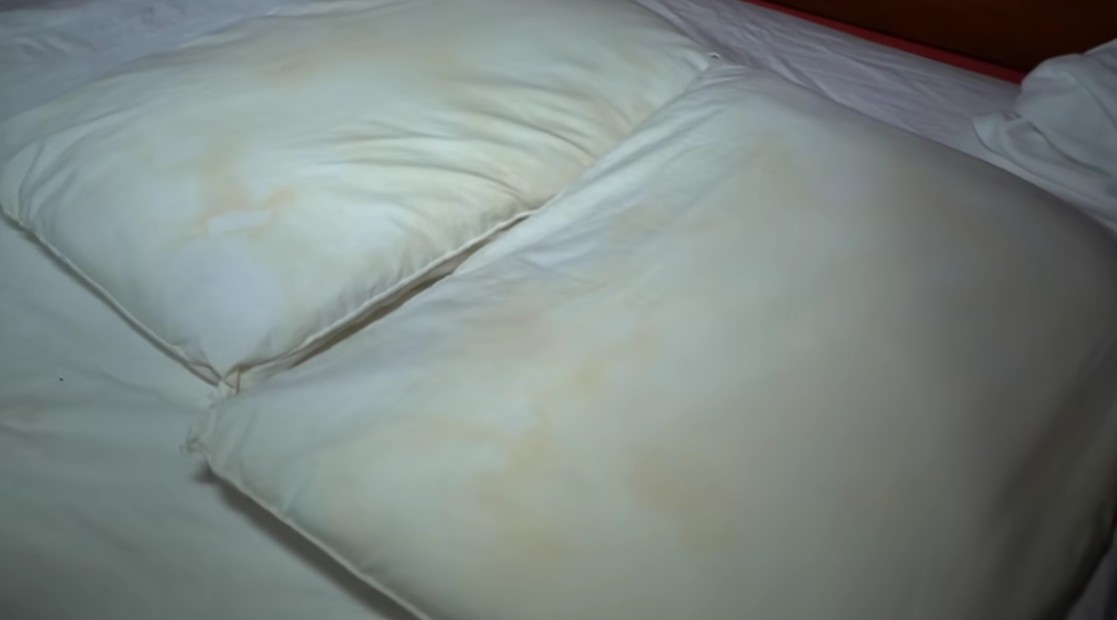 Zažloutlé skvrny na polštářích odpovídají dlouhodobému používání bez výměny nebo praní povlaků a výplně