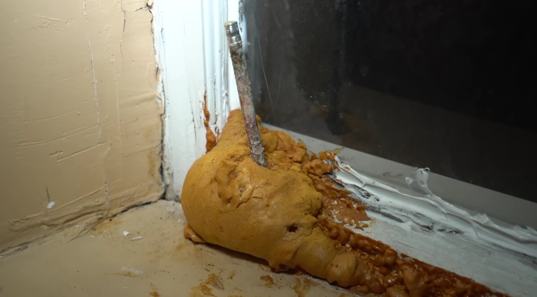 Rozpadlá montážní pěna a neodborně zajištěný šroub u okenního rámu ukazují na provizorní a dlouhodobě neudržovanou opravu okna
