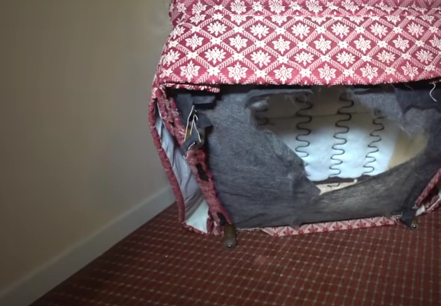 Při pobytu v motelu narazili na silně poškozený gauč, který po otočení odhalil roztržené čalounění, odkryté pružiny a výplň ve stavu nevhodném k dalšímu používání