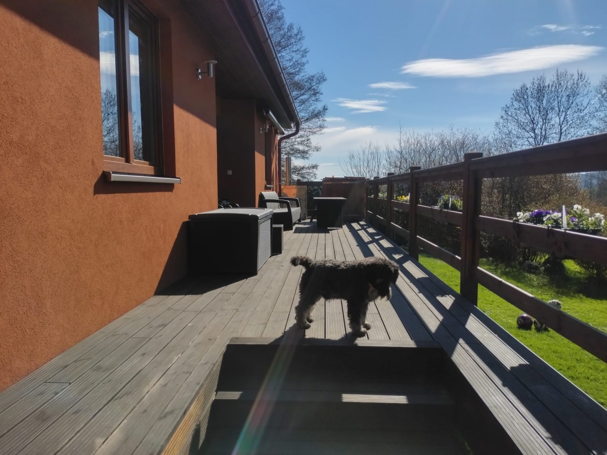 Koupací sud je umístěný na prostorné terase u domu. Díky tomu je snadno dostupný a připravený k pravidelnému používání