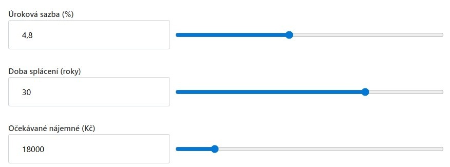 Nyní zadejte úrokovou sazbu, dobu splácení a očekávaný nájem. Sazby momentálně vzrostly, dobu splácení jsme klasicky dali na 30 let a očekávaný nájem je 18 tisíc korun