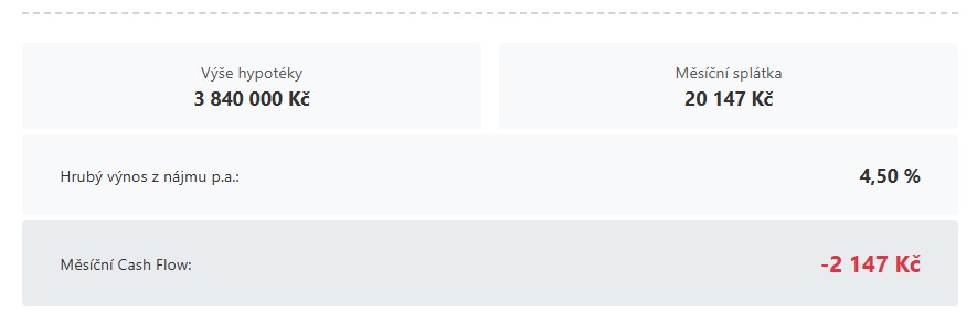 Nyní vám z kalkulačky vyjede hrubý výnos a celková bilance. U nás je to 4,5 % a jsme v mínusu přes dva tisíce