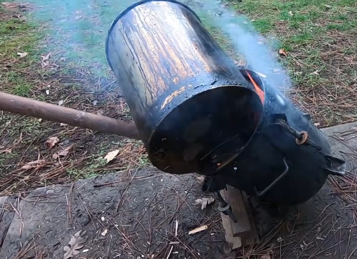 Kutil položil starou kovovou tlakovou nádobu na oheň a nechal ji důkladně vypálit, aby z jejího povrchu odstranil zbytky starých barev a lak