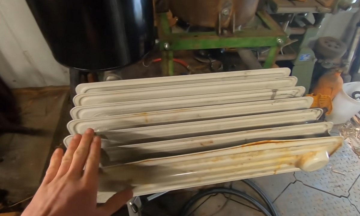 Starý olejový radiátor, který měl sloužit jako chladič dřevoplynu. Přes jeho lamely měl později proudit plyn z generátoru a postupně se ochlazovat