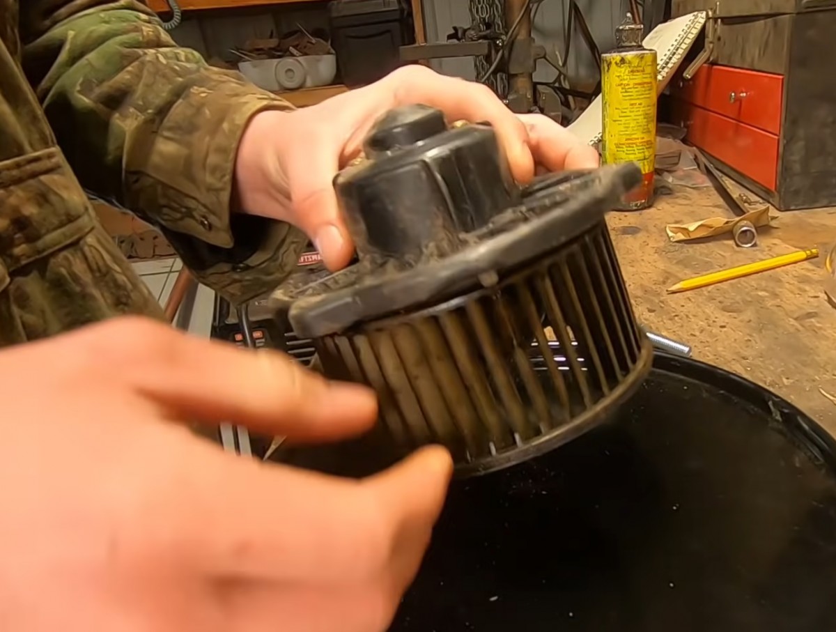 Starý ventilátor z automobilu, který chtěl použít jako dmychadlo. Ten měl na začátku provozu pomáhat nasávat plyn skrz celý systém