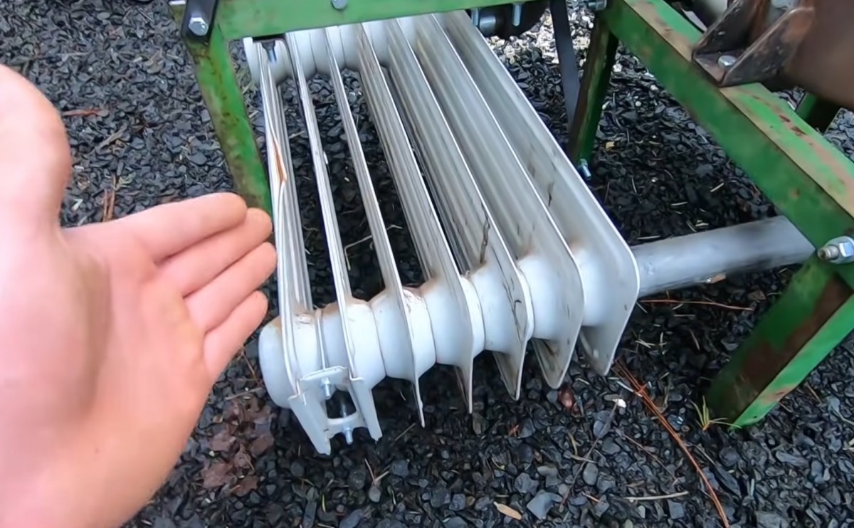 Do potrubí mezi jednotlivými částmi zapojil starý olejový radiátor. Ten měl ochlazovat plyn proudící ze zplyňovače