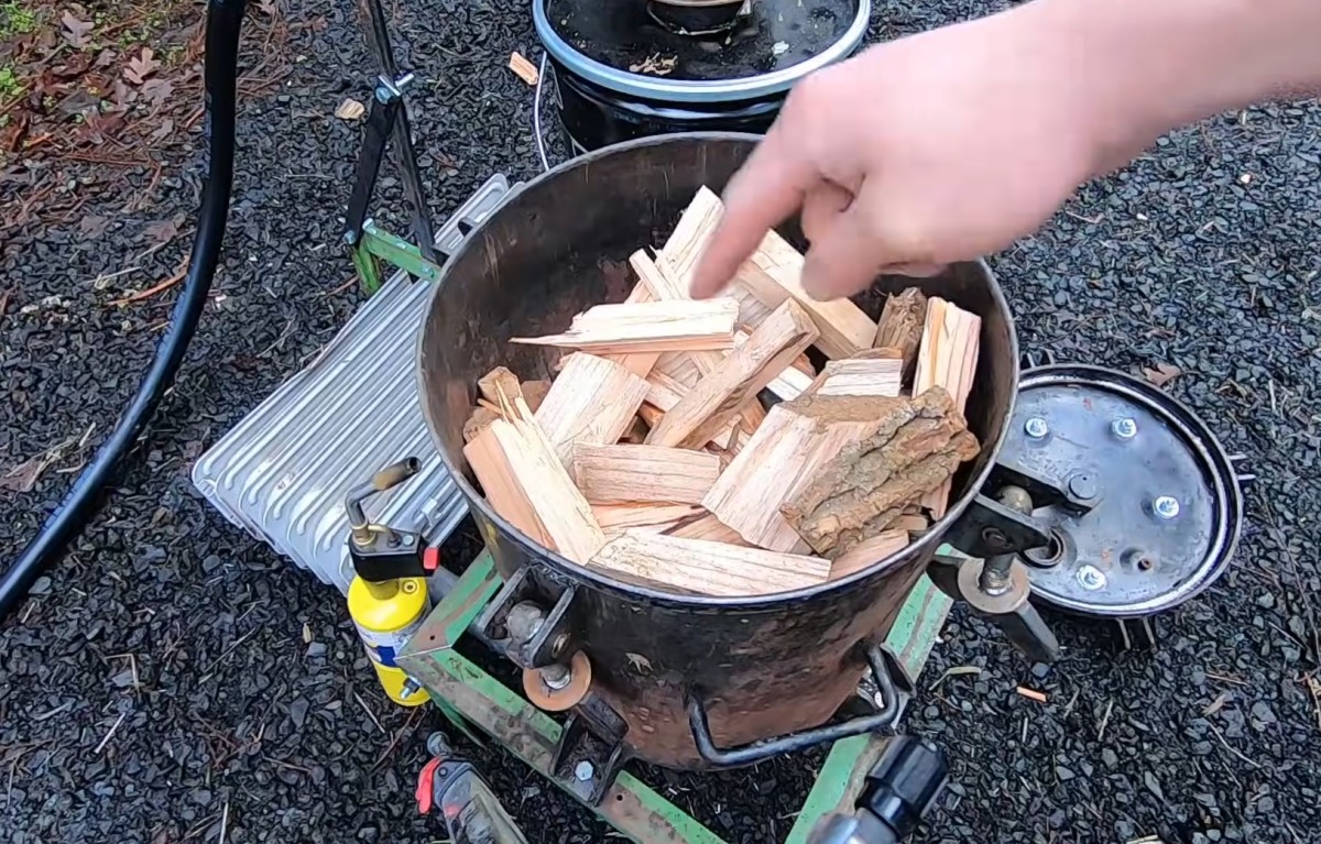 Do zplyňovače nasypal menší kusy dřeva, které měly sloužit jako palivo. Ze zahřívané biomasy se následně vytvářel hořlavý dřevoplyn