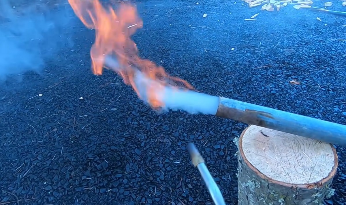 Kutil zapálil plyn vycházející z potrubí dřevoplynového generátoru
