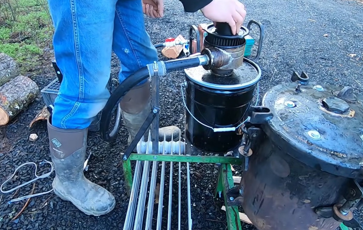 Kutil nasadil na zařízení filtr, který čistí dřevoplyn před jeho dalším využitím