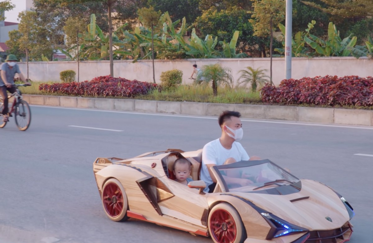 Se synem řídí dřevěný supersport po silnici a vedle něj sedí malé dítě, zatímco modrá přední LED světla svítí a auto přitahuje pozornost kolemjdoucích i cyklistů