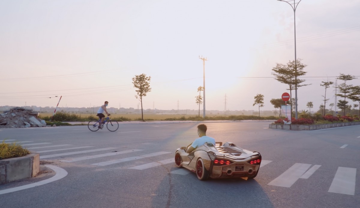 Spolu projíždí se svým dřevěným supersportem křižovatkou při západu slunce, zatímco červená zadní světla svítí a celé auto působí jako skutečný exotický vůz v miniaturním provedení