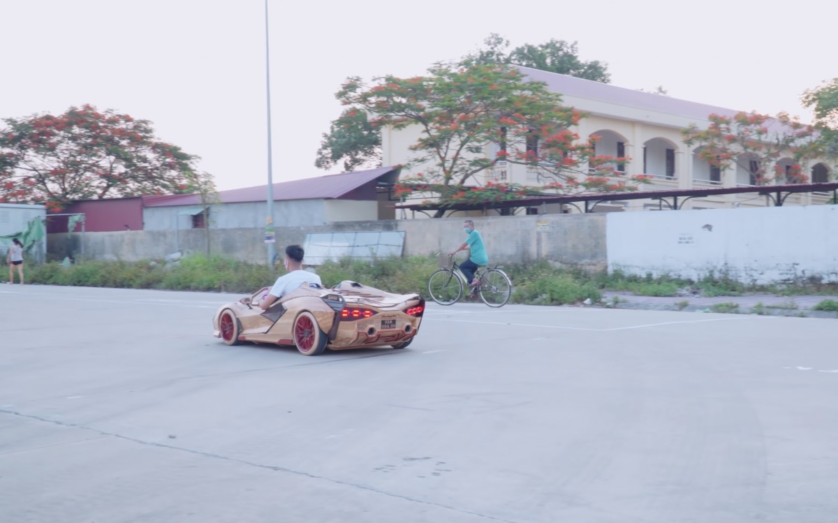 Pohled zezadu na jedoucí dřevěný supersport – červená zadní světla svítí, nízká silueta auta vyniká na silnici a vůz působí překvapivě realisticky i při běžném provozu