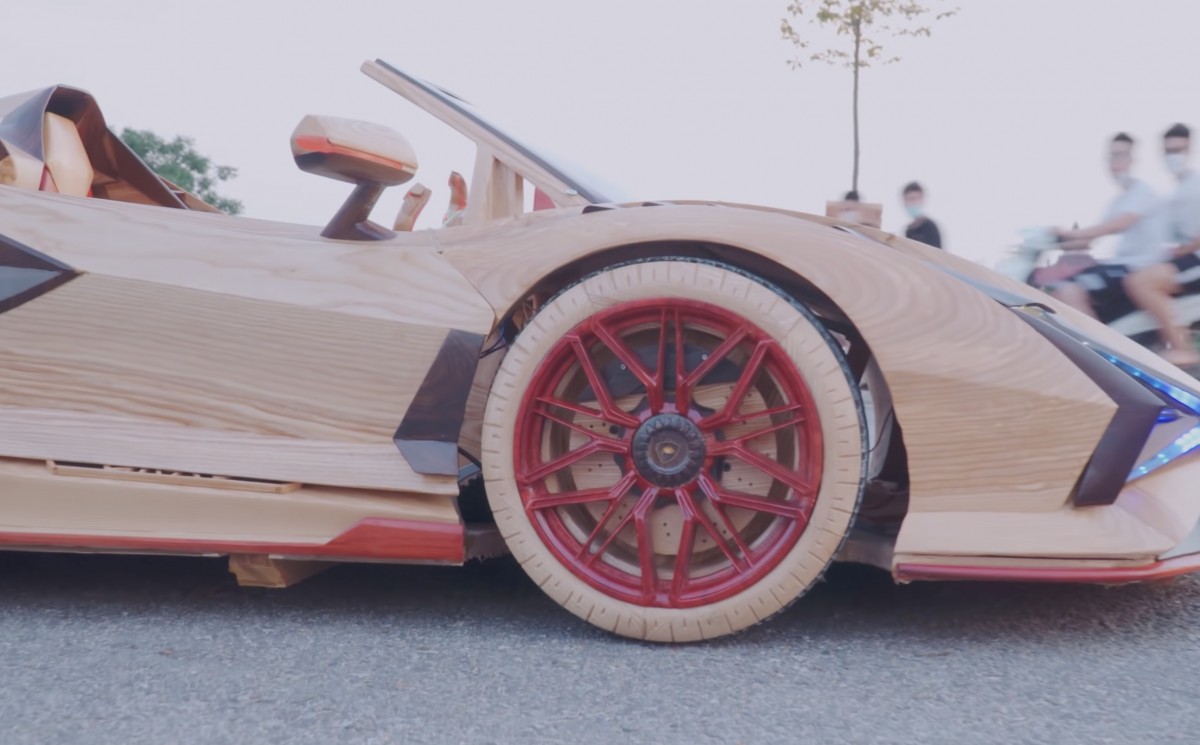 Detail boční části hotového dřevěného supersportu při jízdě – výrazné červené ráfky kontrastují s přírodní kresbou dřeva a celý vůz působí precizně zpracovaně i v pohybu