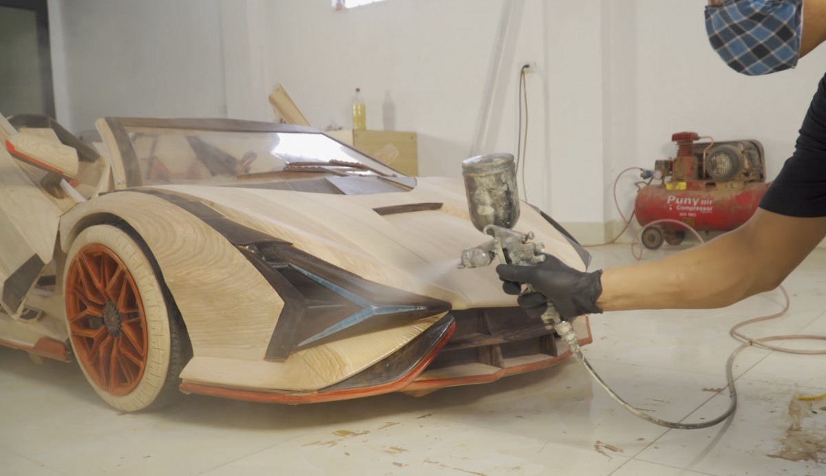 Tatínek pomocí stříkací pistole nanáší ochranný lak na přední část dřevěného sportovního auta a připravuje ho na finální vzhled